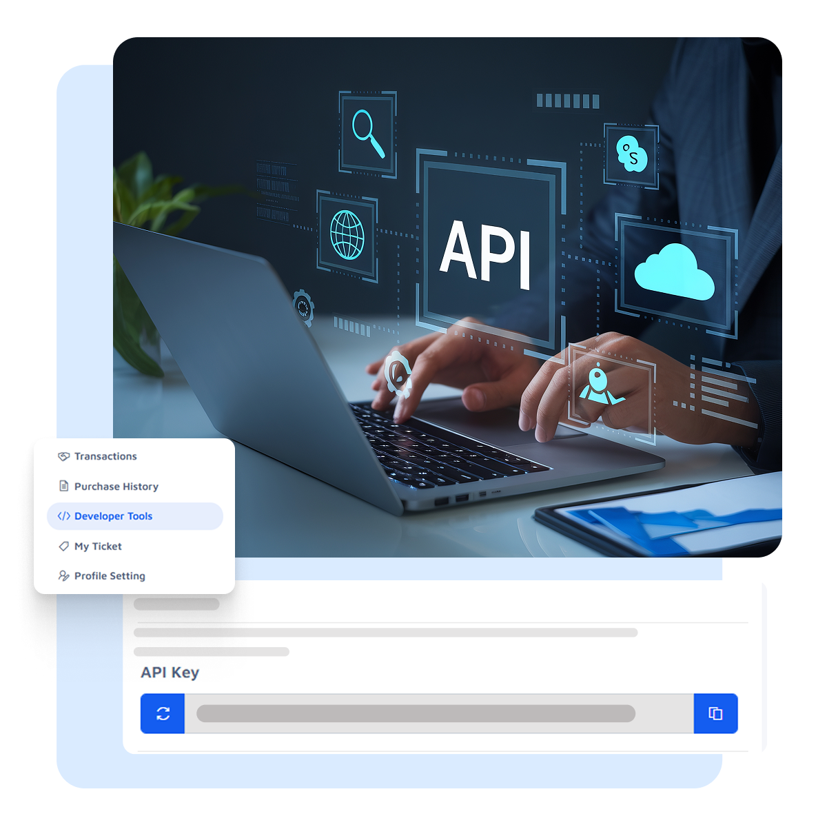 Il suffit de générer votre clé API depuis le tableau de bord, puis d’intégrer nos endpoints simples dans votre site web, application mobile ou système interne.